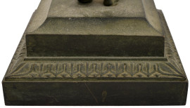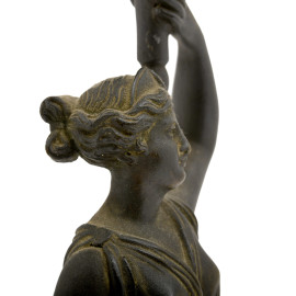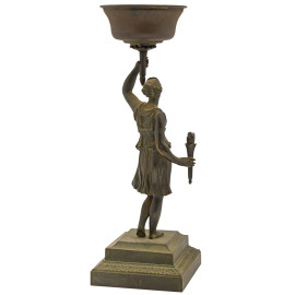Scultura in metallo brunito raffigurante figura classica di giovane panneggiata stante a trattenere una fiaccola nella mano destra e supporto per candela nella mano sinistra. XX secolo, cm 25x8x9, (difetti)