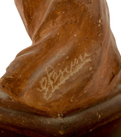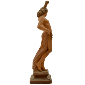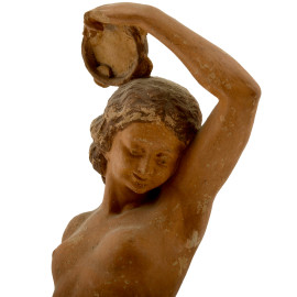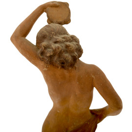 Scultura in terracotta raggiurante nudo di donna. La figura femminile trattiene un delicato panneggio un tamburello. Anni Trenta del XX secolo secolo. Firmato al retro. Cm 36x9x9, (difetti)