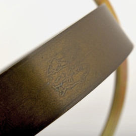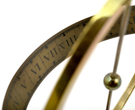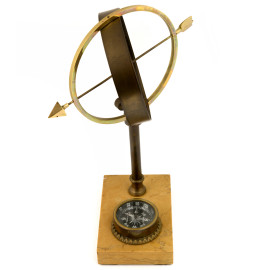 Strumento scientifico in ottone e ferro composto da un anello graduato per la misurazione del calendario solare montato su supporto verticale e dotato di una freccia. Alla base in marmo è integrata una bussola. XIX secolo, cm 26x12x8, (difetti)