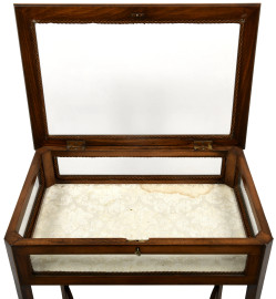 Tavolino a bacheca in noce con gambe sottili arcuate e traverse di rinforzo. Piano in vetro incassato inquadrato da cornice intarsiata. Mobile dotato di cerniere per apertura a ribalta del piano in vetro.cm 73x59x39. XX secolo, (difetti).