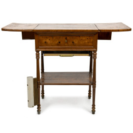 l piano presenta due bandelle, sostenute da supporti estraibili. Cassetto frontale diviso in scomparti. Gambe tornite e raccordate da traversa inferiore che costituisce un ripiano aggiuntivo. Sono presenti modifiche successive non pertinenti come il ripiano estraibile sotto al cassetto e un elemento tubolare in plastica applicato al fusto della gamba anteriore sinistra.