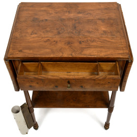 Tavolino a bandelle in radica di noce con cassetto sul fronte, prima metà del XX secolo, cm 68,5x93x36, (difetti e segni di utilizzo)