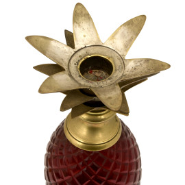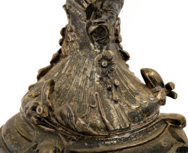 1) Candeliere con paralume in vetro e base ottagonale, con fusto tornito; 2) Candeliere in metallo argentato lavorato a sbalzo con motivi vegetali e base trilobata cesellata; 3) Candeliere con corpo a forma di ananas e finitura in ottone e vetro rosso