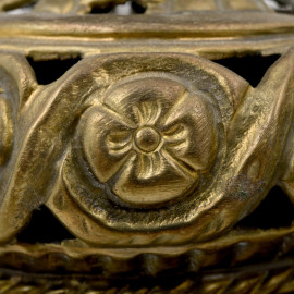 Turibolo incensiere in bronzo dorato finemente cesellato con motivi floreali e decorazioni a rilievo. XIX secolo, altezza cm 26 del turibolo, (difetti).