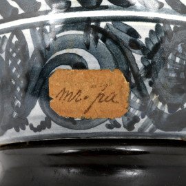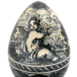 Uovo decorativo in ceramica dipinta a mano con scena di paesaggio nei toni del blu e del bianco, altezza cm 20,5, (difetti di cottura, lievi cadute di smalto stannifero; restauro di felatura che corre verticalmente)