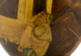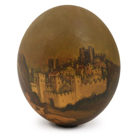 Uovo di struzzo decorato con scena di ingresso ad una città turrita. XX secolo, altezza cm 16, (difetti)