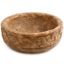 Vasca acquasantiera in marmo a forma circolare. Superficie esterna impreziosita da motivo a onde scolpite. XIX secolo, cm 11x28,5, (difetti)