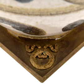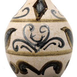 Vaso in ceramica smaltata con decoro dipinto a mano. Motivo floreale stilizzato di ispirazione moresca o mediterranea. Base in metallo con applicazioni angolari di corone di alloro e nastri. XX secolo, cm 20x8,5x8,5, (difetti)
