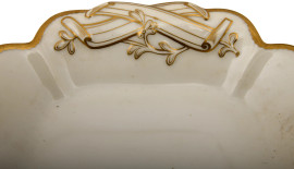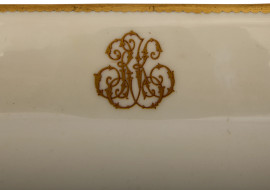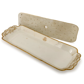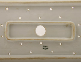 Vassoio da portata e scolatoio in ceramica Haviland & Co Limoge bianca del XX secolo con delicati profili dorati di ispirazione neoclassica con motivi a nastri intrecciati, cm 14x46, XX secolo, (difetti)