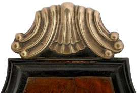 Vassoio in legno laccato nero con prese in metallo argentato sbalzato. Impiallacciatura in radica e profilo sagomato. XX secolo, cm 60x33, (difetti)