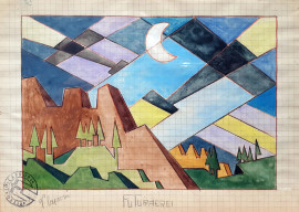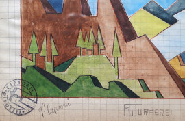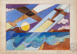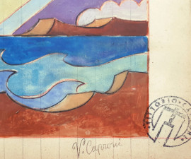 Vittorio Caproni (XX sec.), Futuraerei, lotto composto da due aeropitture a tecnica mista su carta, ciascuno cm 15x20, titolo firma e timbro dell'Artista in basso, con cornice