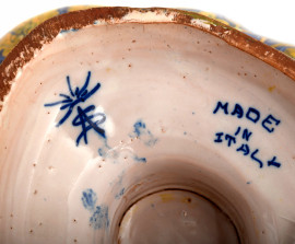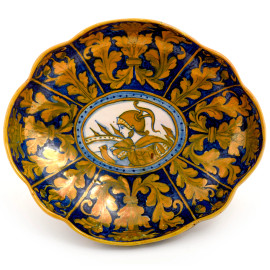 Alzata a lustro metallico a profilo sagomato decorato con profilo di militare e racemi, Ceramiche Santarelli del XX secolo, cm 12x26,5x23, (difetti)