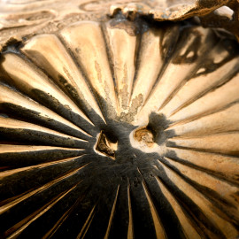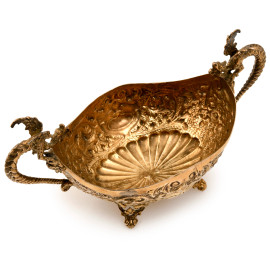 Alzatina in argento vermeil riccamente cesellata e sbalzata a motivi vegetali, poggiante su quattro piedini, manici a foggia di drago, XIX-XX secolo, cm 8x15,5x7,5, gr. 100