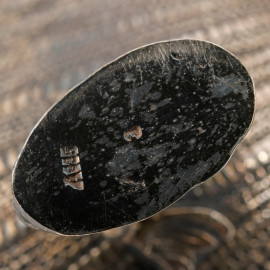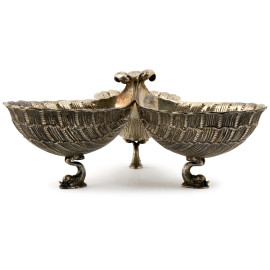 Antipastiera in argento a foggia di conchiglie lavorate a cesello e sbalzo, poggianti su tre piedini a foggia di delfini, XX secolo, cm 9,5x20x20, gr. 390