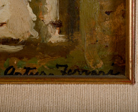 Arturo Ferrari (1861-1932), Lungo il fiume Olona, olio su cartone, cm 18,5x28, firmato in basso a destra, entro cornice, (difetti)