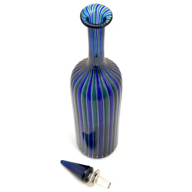 Bottiglia in vetro di Murano della serie "Morandiana" di Venini a canne nei toni del blu e del verde, firmato e datato a graffio sotto la base "Venini Italia 85", altezza cm 46,5 (difetti)