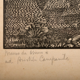 Bruno da Osimo (1888-1962), Castello di Montefiore, xilografia, cm 27x35, firmata e dedicata, entro cornice, (difetti)