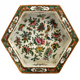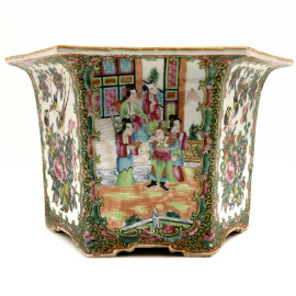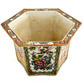 Cachepot esagonale in porcellana "Rose Canton", Cina, inizi del XX secolo, cm 19x28x24,5, (difetti)