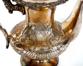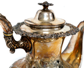 Caffettiera in metallo argentaro riccamente decorata con girali e motivi floreali, XX secolo, cm 25x25x11