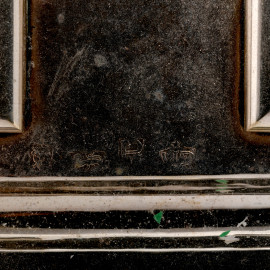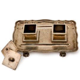 Calamaio in argento con tagliacarte, poggiante su quattro piedini ferini, Inghilterra, Londra, XX secolo, cm 7x18x12, gr. 550
