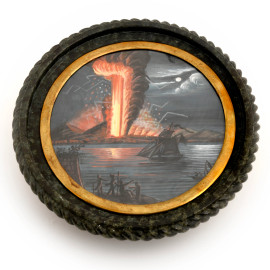 Sotto al coperchio guaches con veduta notturna dell'eruzione di un vulcano