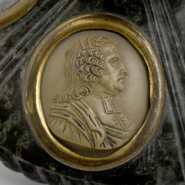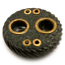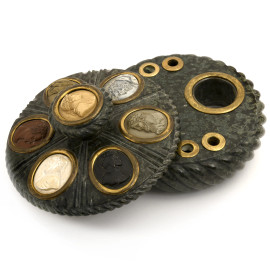 Calamaio in marmo serpentino completo di coperchio con medaglioni e cammei in lava, XIX secolo, cm 9,5x16, (difetti e rotture)