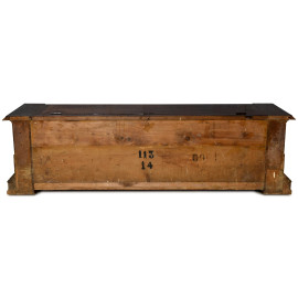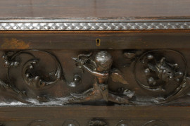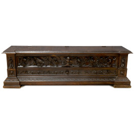 Cassapanca in noce tinta scuro riccamente intagliata con motivi a volute di ispirazione neorinascimentale, XX secolo, cm 51,5x185x45x5, (difetti)