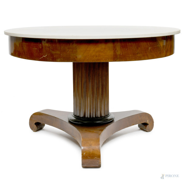 Cassettone Luigi XVI in noce a tre cassetti sul fronte, XX secolo, cm 93,5x117,5x57, (difetti)