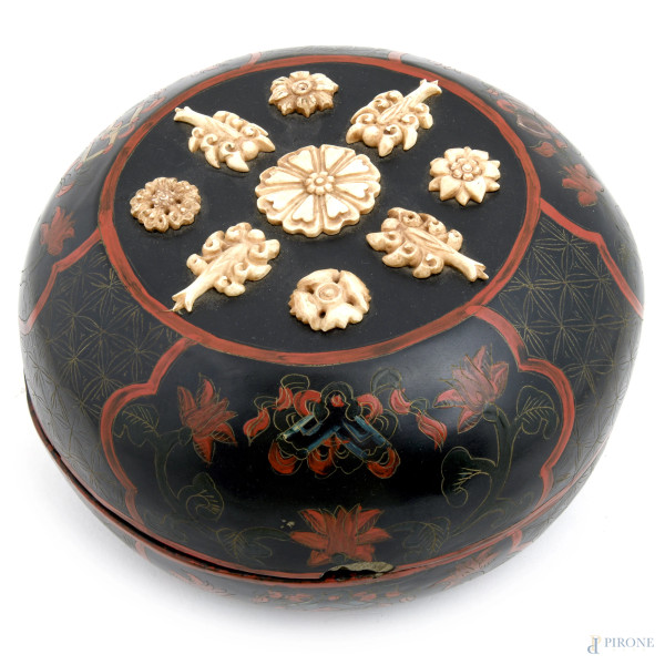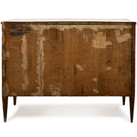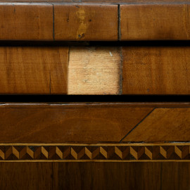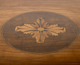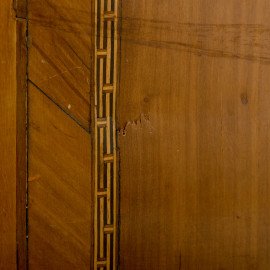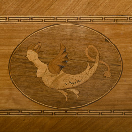 Intarsi in varie essenze. Al fronte boccachiave centrati da cammei raffiguranti figure mitologiche con corpo serpentiforme, busto femminile e ali piumate. Ai lati intarsi a motivi geometrici, greche e decorazioni del repertorio neoclassico.