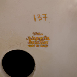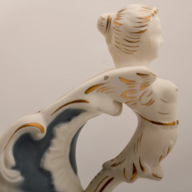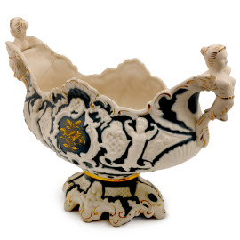 Centrotavola in biscuit con decori a rilievo nei toni bianco-azzurro, doppia ansa a foggia di donne alate, XX secolo, Colonnata, Sesto Fiorentino, cm 30x44x16, (difetti)