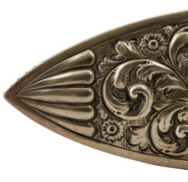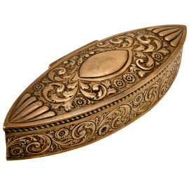 Cofanetto a forma di mandorla in argento decorato a cesello e sbalzo a volute vegetali e motivi floreali, Inghilterra, Birmingham, 1898, cm 3,5x16,5x6, gr. 130