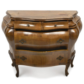 Comò Vecchia Verona a urna, in noce e filetti in bosso, a quattro cassetti con maniglie e pomelli bronzei, XX secolo, cm 75,5x93x43, (difetti)