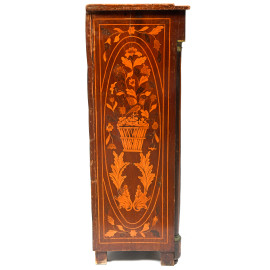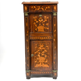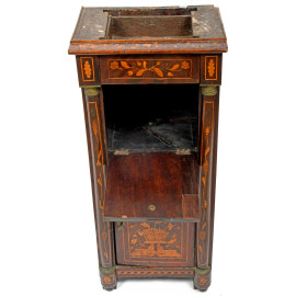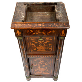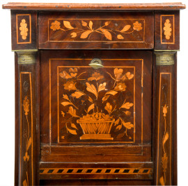 Comodino impiallacciato in mogano con intarsi a motivi floreali, fronte bipartito a 2 sportelli, XIX-XX secolo, cm 84x38x30,5, (assenza del piano, difetti)