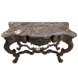 Consolle Luigi Filippo con piano in marmo, impiallacciata in mogano con profilo mosso riccamente intagliato al centro e agli angoli, poggiante su quattro gambe mosse raccordate e terminanti a ricciolo, XIX secolo, cm 98x133x48, (rottura del piano, difetti)