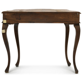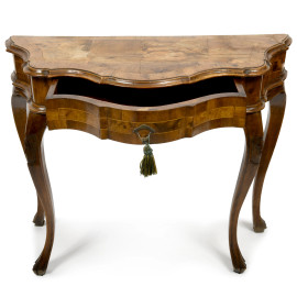 Consolle Vecchia Verona in noce e filetti in bosso dal profilo mistilineo a un cassetto, con gambe intagliate arcuate terminanti in piedi a zoccolo, XX secolo, cm 76x91x37, (difetti)