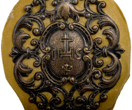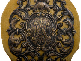 Coppia di acquasantiere da muro in metallo, basi in cartone pressato, XX secolo, cm 30x14, (difetti)