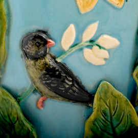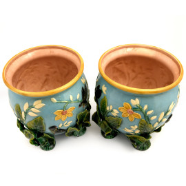 Coppia di cachepot in ceramica policroma con decori a rilievo di uccelli tra i fiori, quattro piedini a foggia di foglie, Cina, XX secolo, altezza cm 27, diametro cm 22, (difetti)