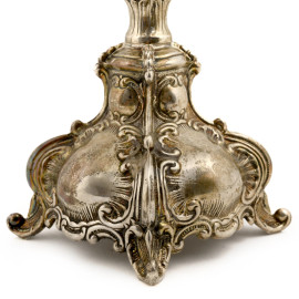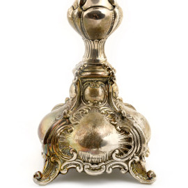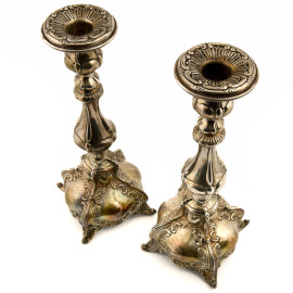 Coppia di candelieri in argento con decori cesellati, peso gr. 720, altezza cm 26