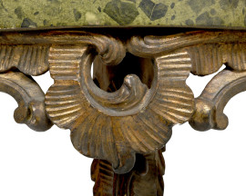 Coppia di consolles con profilo e singola gamba intagliati, piede a foggia di zoccolo, piano dipinto a finto marmo, XIX-XX secolo, cm 78x61x26,5, (difetti)