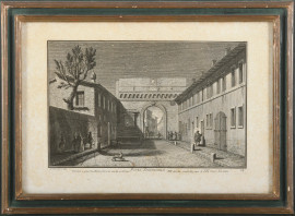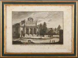 Coppia di incisioni di Giuseppe Vasi: la Fontana dell'Acqua Paola e Porta Settimiana, cm 29,5x41 entro cornice, (difetti, gore)