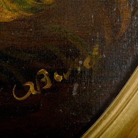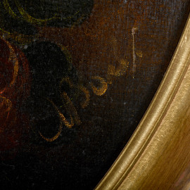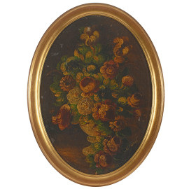 Coppia di nature morte di fiori, olio su tela applicata su tavola ovale, XX secolo, cm 67x47 entro cornice, (difetti)