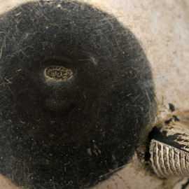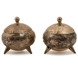 Coppia di salierine in argento cesellato poggianti su tre piedini conici, cm 4x4, peso totale gr. 40