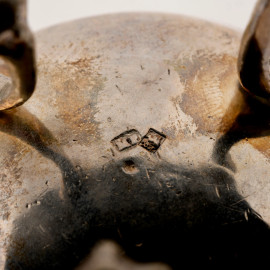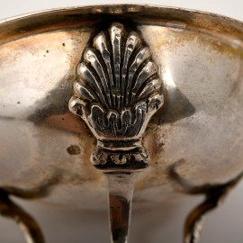 Coppia di salierine in argento cesellato poggianti su tre piedini, una recante inziali incise, XX secolo, XIX-XX secolo, altezza cm 5, peso totale gr. 130