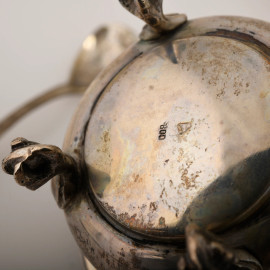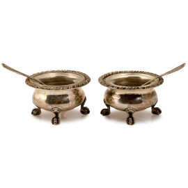 Coppia di salierine in argento poggianti su tre piedini ferini, con cucchiaini, cm 3,5x6, peso totale gr. 100