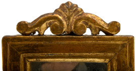 Coppia di specchierine in legno dorato e intagliato, fine del XIX secolo - inizi del XX secolo, cm 27x16,5, luce cm 16x10 (difetti)