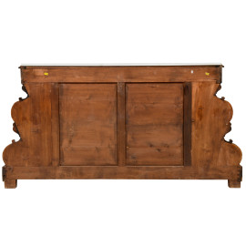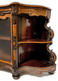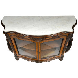 credenza a vetrina in vari legni con piano in marmo, profilo mistilineo, fronte a due sportelli e ripiani a vista laterali, XX secolo, cm 94x147x53, (difetti)