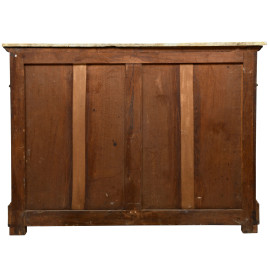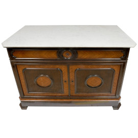 Credenza in satinwood e mogano con piano in marmo, a un cassetto e due sportelli, XX secolo, cm 98x130x57, (difetti)