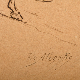Donna a cavallo, china su carta, cm 20x12,5 entro cornice, firmato De Albertis in basso a destra, (difetti)