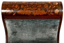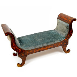 Dormeuse in legno intarsiato in varie essenze a motivi di fiori stilizzati e volute, fine del XIX secolo, cm 70x127x47, (difetti)