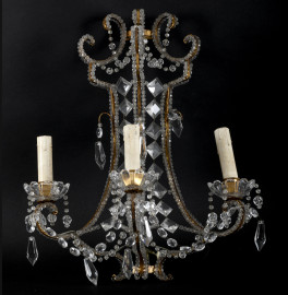 Elegante coppia di appliques a tre luci da parete in metallo dorato finemente lavorato e arricchite da molteplici elementi in cristallo. XX secolo, cm 46x34, difetti